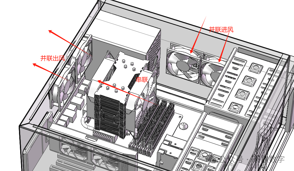 这个台式电脑主机的模型是在网上下载的模型,然后用solidworks简单处理,内部的风扇串并联如下图所示,