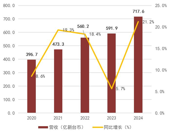 表 1:奇鋐科技 2020—2024 年营收(亿新台币)及 增速(%)